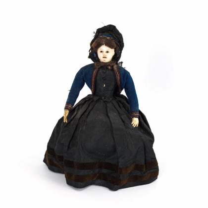 Puppe mit Papiermaché-Brustkopf, eingesetzten Glasaugen, offenem Mund mit Zähnchen, gemalten Haaren sowie brauner Echthaarperücke mit Hut. Originaler Lederkörper. Original bekleidetet mit schwarzem Biedermeier-Kleid mit Reifrock