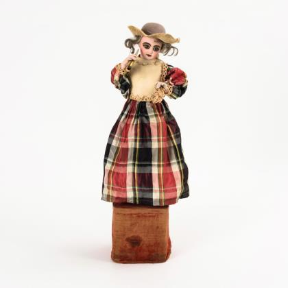 Später Automat von Léopold Lambert (wie der Schlüssel mit dem Markenzeichen "LB" zu erkennen gibt), mit Porzellankopf von Limoges. Feste blaue Glasaugen, helle Mohairperücke mit dunklen Spitzen. Mechanik intakt: bewegt Kopf und Arme zur Musik. Wohl jünger ergänztes, kariertes Kleid, grauer Filzhut. Anbei rosa Kleid