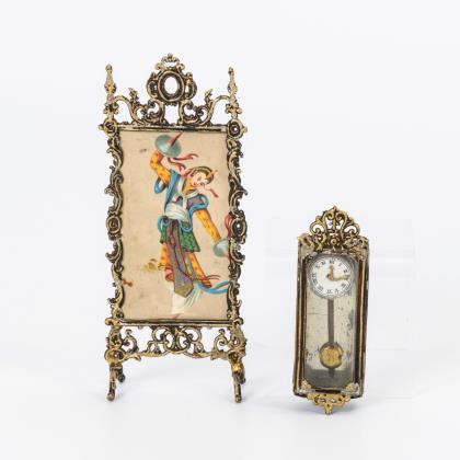3-seitig verglaster Uhrenkasten mit römischen Ziffern, Pendel und verspiegelter Rückwand. Reich verzierter Paravent mit farbig lithografiertem Pappbild