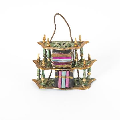 3-etagiges, filigran durchbrochenes Wandregal mit originalen Papierbüchern
