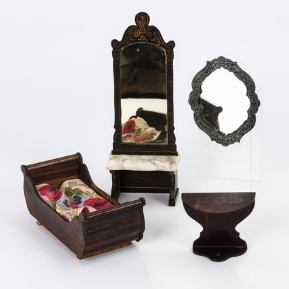 Wiege, Stubenwagen und Püppchen für die Puppenstube