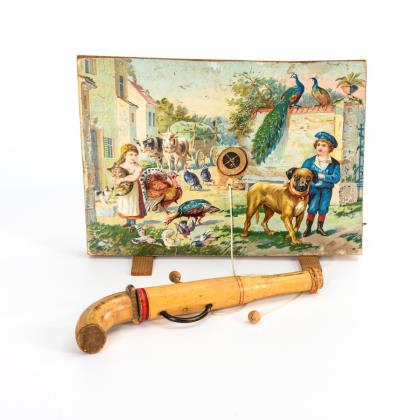Stellwand mit Zielscheibe und Kugel, verso ein bewegliches Huhn mit Blasebalg. Dazu eine Holzpistole