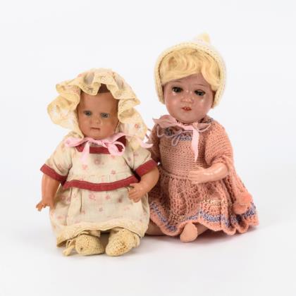 1x mit Kurbelkopf, Resten einer Echthaarperücke und Massekörper, 1x Ganzbiskuit-Püppchen mit Echthaar. Beide mit hellen Kleidern und gemalten Schuhen und Strümpfen