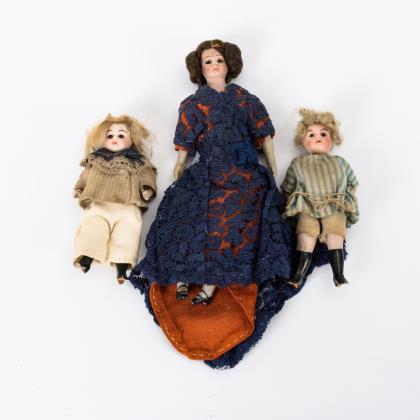 Stoffpuppe mit Brustkopf und Biskuitgliedern. 2 originalbekleidete Ganzbiskuit-Püppchen. Alle mit eingesetzten Glasaugen und Mohairperücken