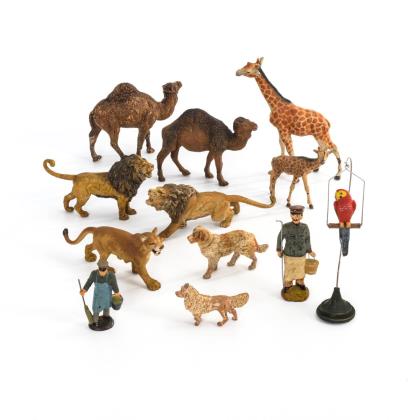 3 Löwen, 2 Giraffen, 2 Hunde, 2 Dromedare, 1 Papagei auf Stange, dazu 2 Zoowärter