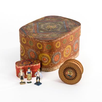 Große und kleine Spanschachtel mit Blumenmalerei, runde Schnitzdose (um 1920, bezeichnet "Berchtesgaden") und 3 volkstümliche Holzfiguren