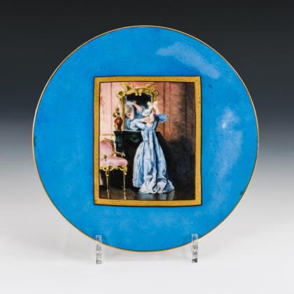 Teller mit blauem Fond, im Spiegel eine Rechteckkartusche mit der Darstellung einer Rokokodame bei der Toilette