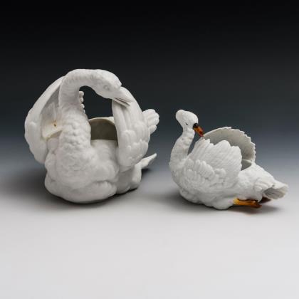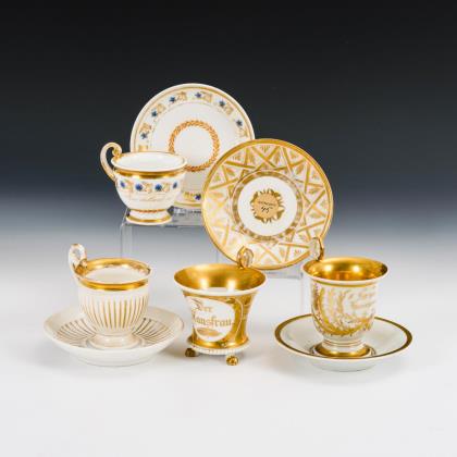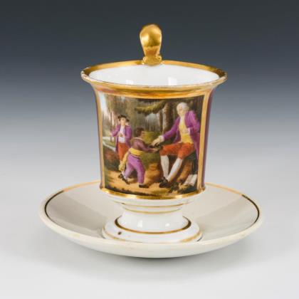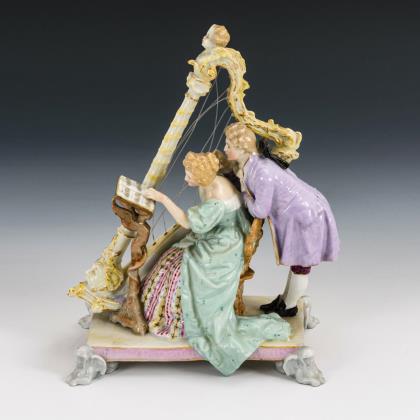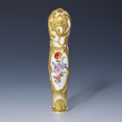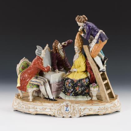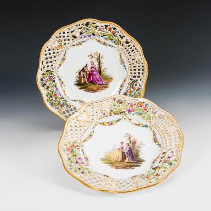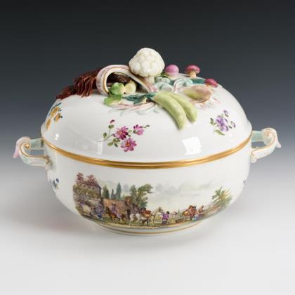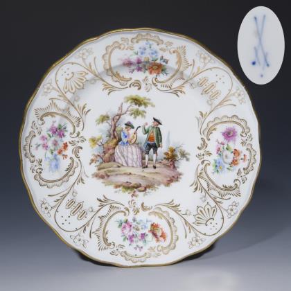 Dekor nach einem Meisen-Modell von 1745. Farbig bemalt, Golddekor "Dulong" mit Blumenbuketts in den Kartuschen. Im Spiegel "Galantes Paar in Parklandschaft" nach einer Vorlage von Jean Antoine Watteau. Unbekannte Pressmarken, Schwertermarke