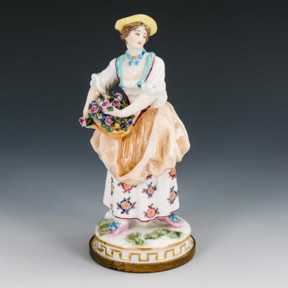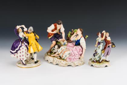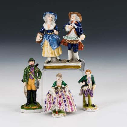 Sich verbeugende Rokokodame sowie sich verbeugender Rokokoherr, Jäger mit erlegtem Hasen und Kinderpaar mit Körben