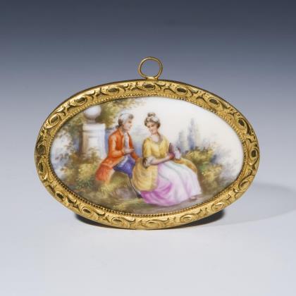 Galantes Paar in Parklandschaft. Farbige Szene nach Jean Antoine Watteau. Messing-Rahmen mit feststehender Öse. Unglasierter Boden, Ritzmarke