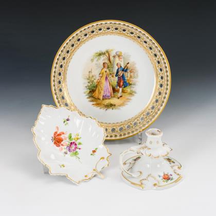 2x Höchst: Blattschale (L 16,5 cm) und Handleuchter (H 8 cm) mit Blumenmalerei. / 1x Fürstenberg: Durchbruchschale mit Watteaumalerei (Ø 21,5 cm)