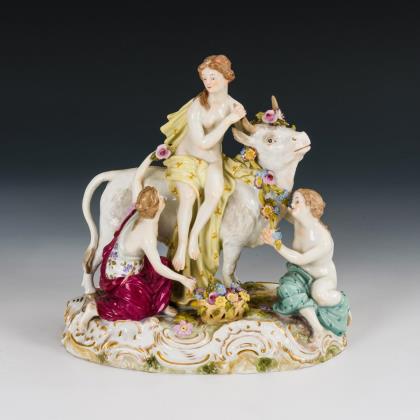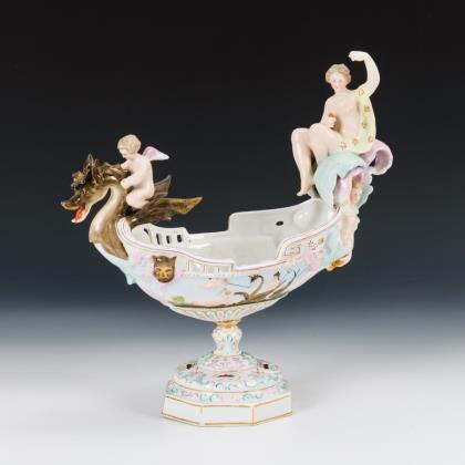 Tafelaufsatz in Schiffchenform mit einem drachenreitenden Putto sowie einer Venus, auf der Wandung figürliches Reliefdekor, oktogonaler Fuß