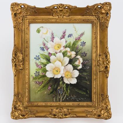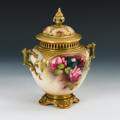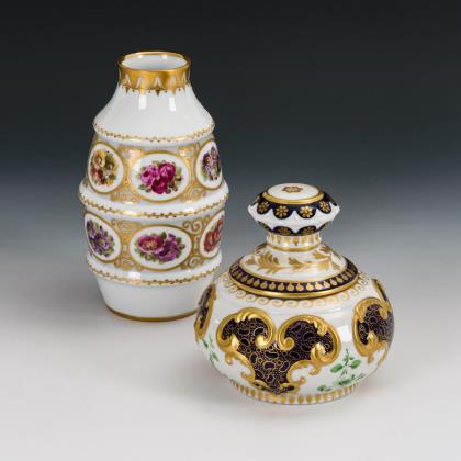 Umlaufend reiches Reliefgold-Ornamentdekor. Beidseits farbige Blumenbuketts. Ohne Marke