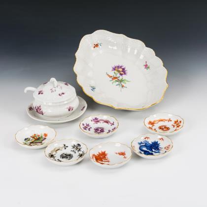 1 + 7x Meissen, 1. Wahl und 2 Schleifstriche: Ovalschale mit Altozierrelief (L 26,5 cm) und 6 Konfektschälchen mit indianischen Motiven (Ø 8 cm). / 1x Nymphenburg: Konfitürendose mit Altozierrelief, festem Unterteller, Löffelchen und Purpurmalerei (Ø 13 cm)