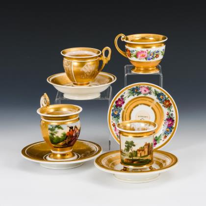1x mit der Darstellung eines Liebespaares in einer Landschaft, 1x mit Landschaftsmalerei, 1x mit Blumenmalerei, 1x goldgraviert