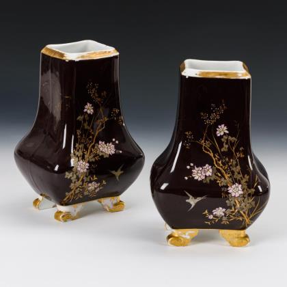 Rechteckige Vasen auf vier Füßen, schauseitig ein im japanischen Stil gemaltes Blumenbukett in Gold und Silber mit farbigen Emailblüten sowie einem silbernen Vogel