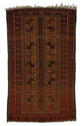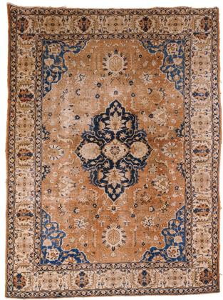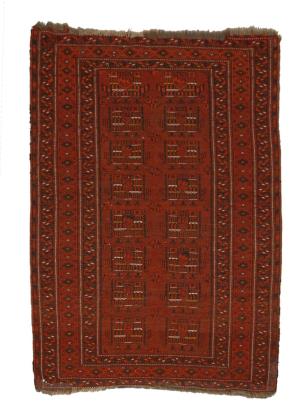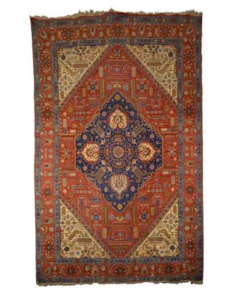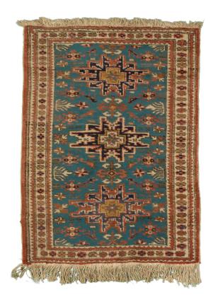 Geometrisch stilisiert durchgemusterter Teppich mit großem Sechseckmedaillon und Kreuzblüte im Zentrum, hakenbesetzte Füllornamente und kleine Balken. Dreireihige Bordüre mit Blüten und Palmetten. Bleiplombe