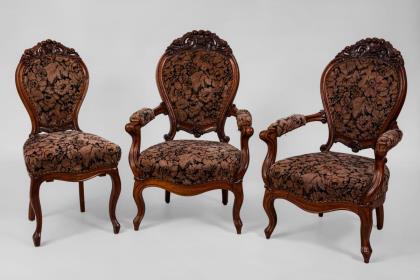 2 stilypische, gepolsterte Armlehnstühle und 1 Stuhl mit Ballonlehnen und Volutenfüßen, bekrönt mit Blumenschnitzerei; dunkler Samtbezug mit Floraldekor