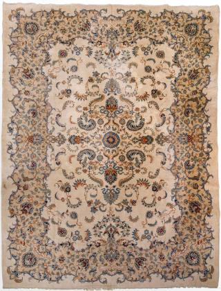 Cremefarbener Fond mit flächendeckendem Floraldekor, kleinen Löwen und Vögeln. Kraftvoll geschweifte, einteilige Bordüre