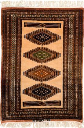 4 Stufenhexagone mit zentralen Kreuzblüten auf elfenbeinfarbenem Mittelfeld mit begrenzenden Balken. Mehrreihige Bordüre mit geometrisierten Ornamenten, geknotete Fransenabschlüsse