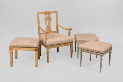 1 Armlehnstuhl und 3 Hocker, Stuhl mit lyra-förmigem Mittelbrett, 2 weiß gefasste Hocker mit antikisierendem Dekor, Polster mit rot-cremefarben-gestreiftem Bezug
