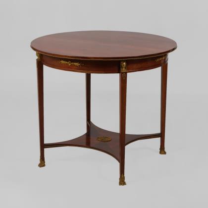 Runder Tisch auf 4 Pfeilerbeinen, verstrebt mit rautenförmiger Ablagefläche, dekoriert mit antikisierenden Messingapplikationen