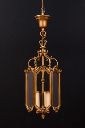 Hexagonale Hängelampe mit verglastem Rocaillengestell und Mittelstrebe mit Glocken-Baldachin, Fassung mit Kerzentüllen