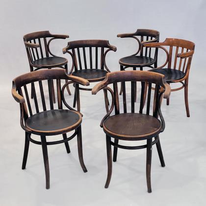 6 stiltypische Kaffeehausstühle "Nr. 24" mit Armlehnen, Rückenlehnenverstrebung und Sperrholzsitz