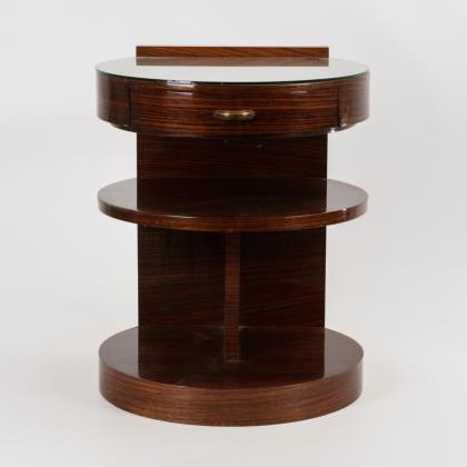 Halbrunder, tonnenförmiger Beistelltisch mit Zargenschub und offenen Ablageflächen
