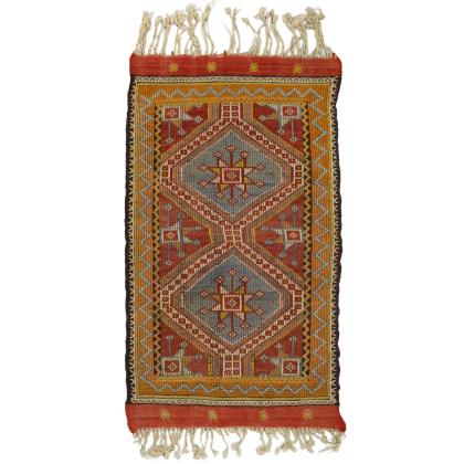 Zentrales Stangenmedaillon mit 2 sechseckigen Nischen, gefüllt mit großen achtstrahligen Sternen. Stilvolle Konturierung durch Farb- und Wellenbänder, Kelimabschlüsse mit einzelnen Klammermotiven, lange, kordelartig verknotete Fransen