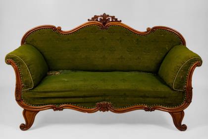 Geschwungener Korpus mit Volutenschnitzereien und Blattwerk-Bekrönung, auf Volutenfüßen; defekter grüner Bezug mit Ziernageldekor