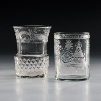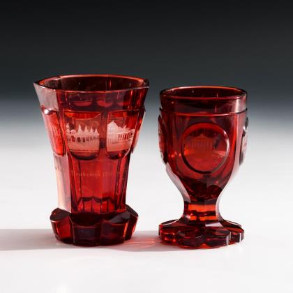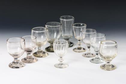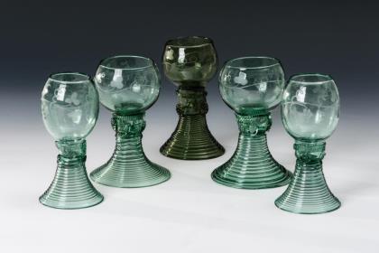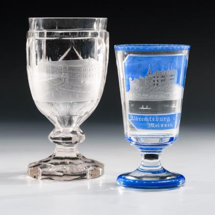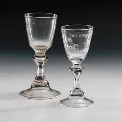 1x mit eingeschliffenem Luftblasenkranz am Kuppaboden, Hohlschaft und Rundfuß mit umgeschlagenem Rand. / 1x mit Schliffdekor und der Aufschrift "wie der oberste befielet.", Hohlbalusterschaft und Rundfuß mit umgeschlagenem Rand. Beide mit Abriss