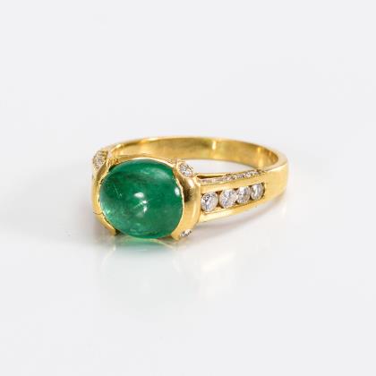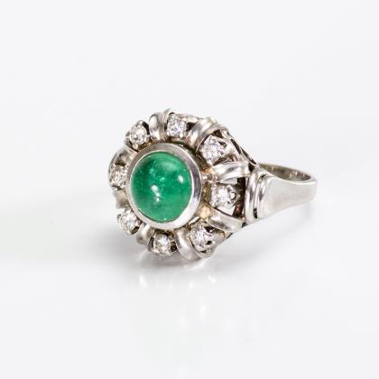 Zargengefasster Smaragdcabochon, umringt von 8 chatongefassten Brillanten. Schmale Schiene