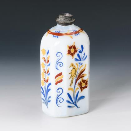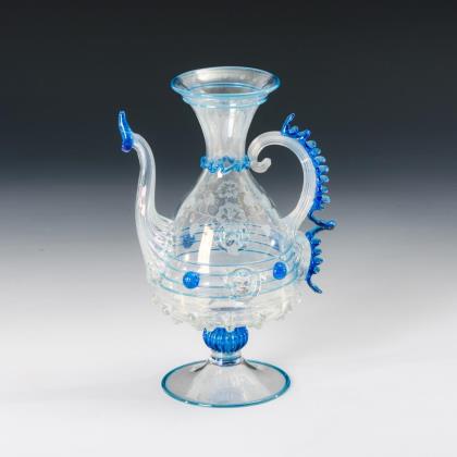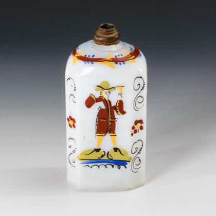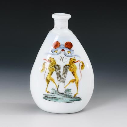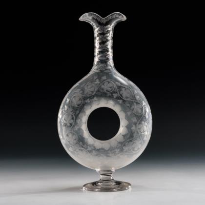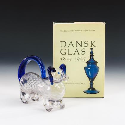 Branntweinflasche in Form eines Hundes mit schrägoptisch geblasenem Korpus un geschwungenem Schwanz als Henkel. Dazu das Buch: Larsen, Alfred/Riismöller, Peter/Schlüter, Mogens, Dansk Glas 1825-1925, Kopenhagen 1979; vgl. dort Abbildung 341/342