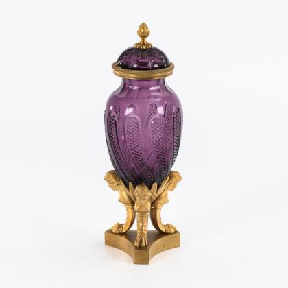 Ovoide Vase mit facettiertem Hals und geschweiften Steinelschliffstreifen auf der Wandung, Knaufdeckel. Mit bronzemontiertem Rand und Deckel, auf Bronzefuß mit drei Karyatiden