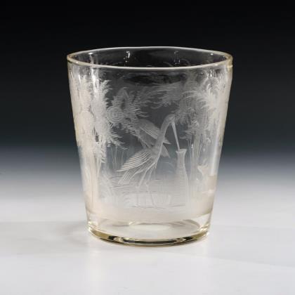 Gefußter Kraterbecher mit facettierter Kuppa. Umlaufend die Darstellung einer Waldlandschaft mit Hirsch und Reh