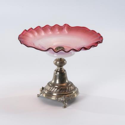 Schale mit gewelltem und mehrfach gekniffenem Rand, zinnmontierter Fuß mit drei kleinen Rocaillefüßchen