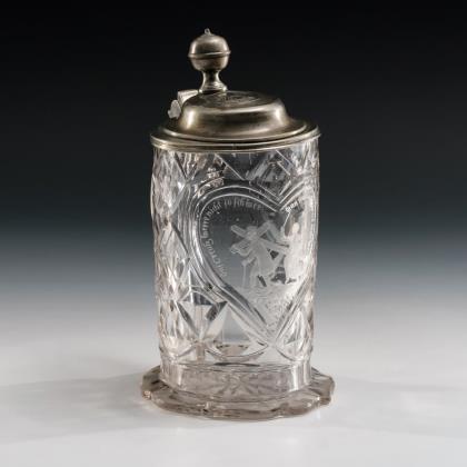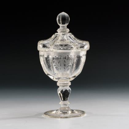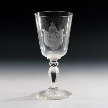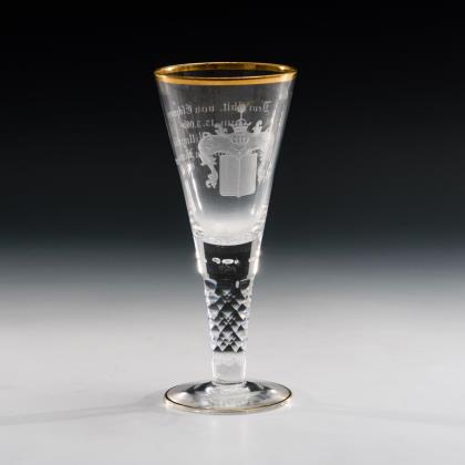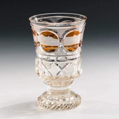 Glockenkuppa, facettierter, kurzer Schaft und Rundfuß mit Kerbschliffkranz und ausgekugeltem Abriss. Schauseitig ein Medaillon mit der mattgeschliffenen Darstellung einer Küste mit Altar, Palmen, Anker und Segelschiff, verso Kerb-, Linsen- und Steinelschliff
