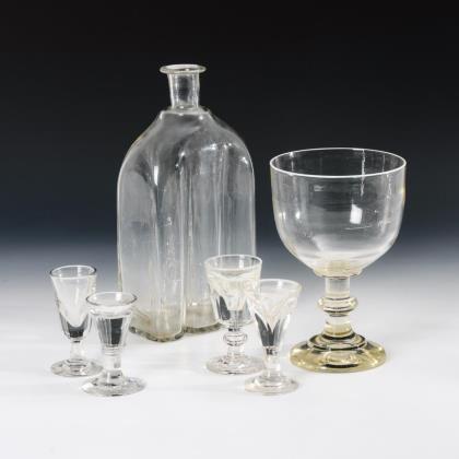 Schauseitig das geschliffene und graustaffierte Monogramm "KK". Nachtflasche (ohne Stopfen, H 18,5 cm) mit Becher (H 9,5 cm), 2 Flakons (H 15cm), 1 Schale (L 23,5 cm) und 1 Kerzenhalter (H 10 cm)