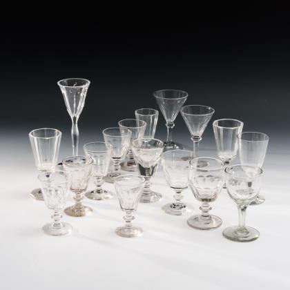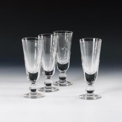 Elegante Gläser mit schlank-konischer, in den facettierten Schaft übergehender Kuppa, Quadratfuß, ausgekugelter Abriss