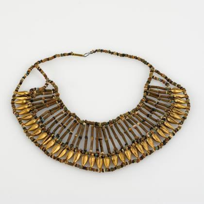 Pektoralartiges Geflecht aus farbigen Tonscheiben, Röhrchen und goldfarbenen Metallgliedern. Einhängehaken