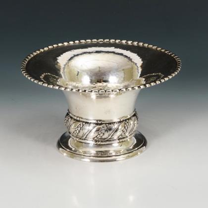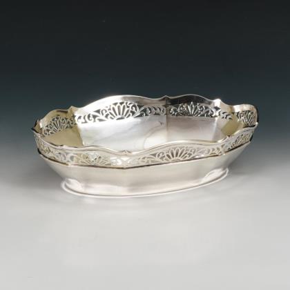 Halbkugelige Schale mit Bandornamentik und vegetabilen Griffen. Originaler Glaseinsatz mit Wellenrand und Bodenschliffstern