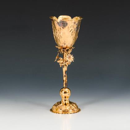 Konische Vase mit einseitiger Gravur: Stilisierte Libelle und Iris. Goldfarbener Fuß, Henkel und Mündung mit Seerosen- und Irisblättern sowie kleiner Messing-Einsatz