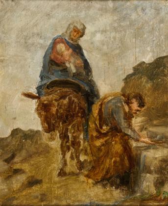 Auf dem Esel sitzende Maria mit dem Jesuskind sowie Joseph an der Quelle