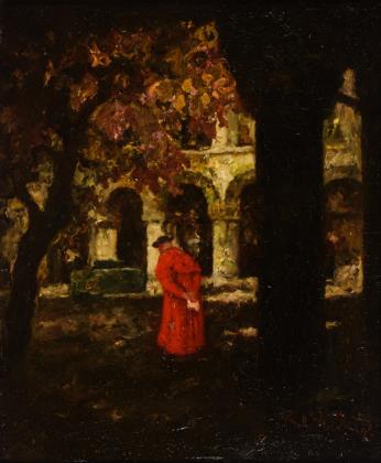 Ein Kardinal im leuchtend roten Talar beim Gang im Kreuzgang mit kontrastreichem Lichtspiel