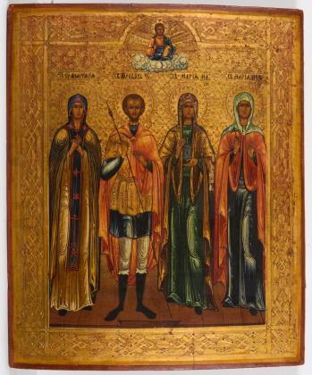 Darstellung von vier Heiligen sowie Jesus Christus in einer Wolke darüber