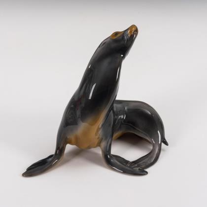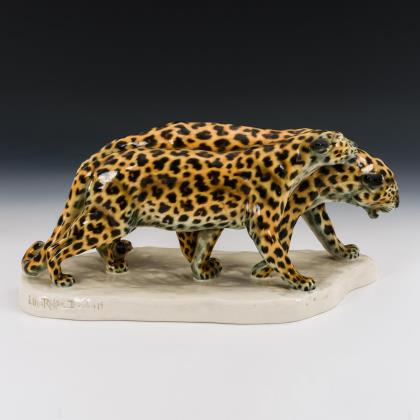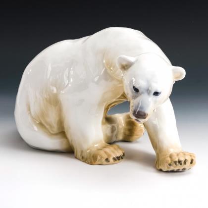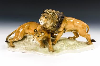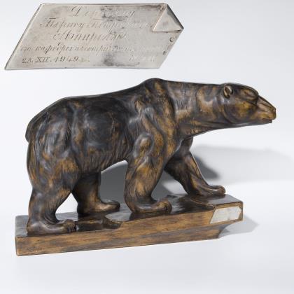 Vollplastisch geschnitzt. Naturalistisch modelliert. Im Boden Klebezettel mit kyrillischer Beschriftung, 1932 bezeichnet. Fels-Sockel mit applizierter Silber-Plakette mit gravierten kyrillischen Schriftzügen, 1949 datiert, seitlich drei Punzen