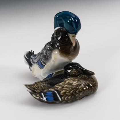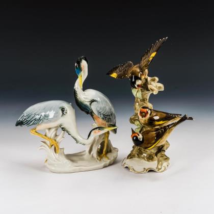 1x grüne Mühlenmarke ENS, Modell-Nr. 7299(?): zwei Graureiher auf Natursockel (H 23,5 cm). / 1x Stempelmarke Hutschenreuther: drei Stieglitze auf einem Baum (H 27 cm)