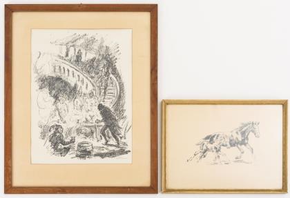 Stute und Fohlen: verglast und gerahmt: 26 x 33,5 cm | Szene in Auerbachs Keller aus Goethes Faust, Platte: 37 x 27,5 cm, verglast und gerahmt: 52 x 41 cm