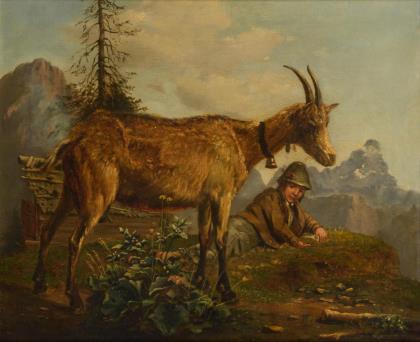 Die Ziege mit Halsglocke im Bildzentrum auf einem Bergvorsprung, vor dessen Abgrund ein Junge im Gras liegt, während im Hintergrund eine Hütte vor den Gipfeln zu sehen ist